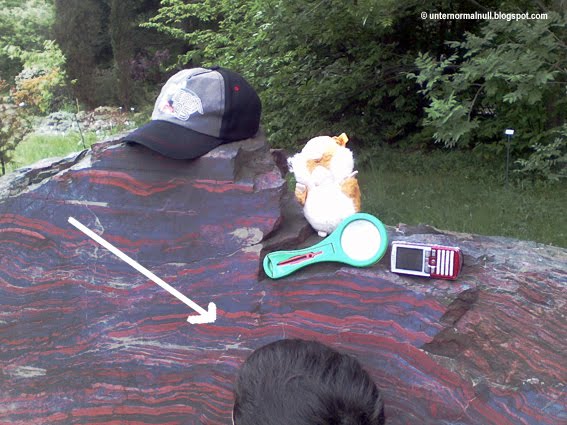Dieses Mahn- und Denkmal erinnert an die vom Stein erschlagenen Geologen. Abrupt beendeter Forschergeist findet so kurz und kernig seinen Ausdruck. Das sich aushauchende Leben spiegelt sich in seinen Abschnitten wieder. Das erste Kuscheltier, die erste Lupe, das erste Baseballcape und das erste Handy: Knapper kann man ein erfülltes Leben nicht beschreiben. Der Stein wirft auch mit Fragen um sich: Wann ist mein Leben zu Ende? War es sinnvoll? Wenn ja, für wen? (Der Urheber des Werkes wurde mit einem Pfeil kenntlich gemacht.)